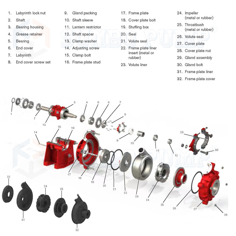 Parts in contacting with the medium are made of latest wear-resistance 27% chrome alloy white iron with hardness 62HRC over, which has an highly abrasive for maximum resistance to strong abrasive, coarse particle.